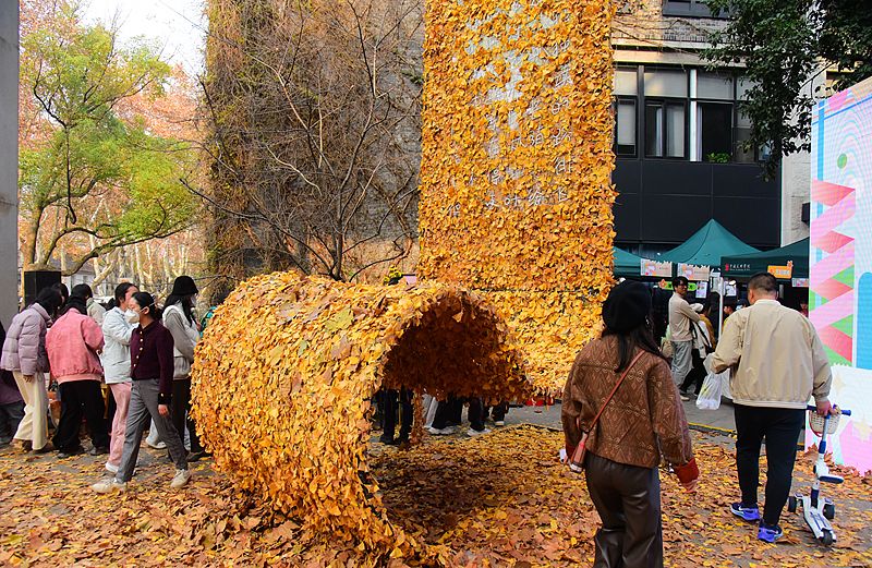 上星期五,我国美术学院第十九届秋叶艺术节在南山校区拉开序幕,这盏名为《无尽之光》的落叶台灯便快速走红,成为南山路上一道亮丽景色。