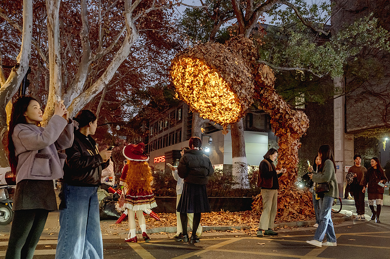 最近,杭州南山路上一盏巨大的秋叶台灯提升杭州网红,招引许多人盛装装扮来此打卡。